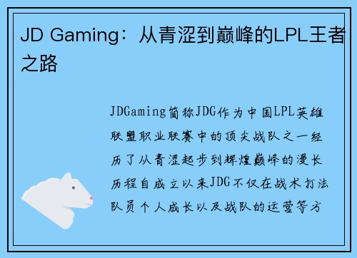 JD Gaming(简称JDG)作为中国LPL(英雄联盟职业联赛)中的顶尖战队之一,经历了从青涩起步到辉煌巅峰的漫长历程。自成立以来,JDG不仅在战术打法、队员个人成长、以及战队的运营等方面不断积累经验,而且通过多个赛季的磨砺,终于在2022年登顶LPL,成为英雄联盟电竞的王者之一。本文将从战队的建立、战术风格、重要成员的崛起以及战队管理的成功四个方面,详细回顾JD Gaming的成长与辉煌,分析其从青涩走向巅峰的历程。