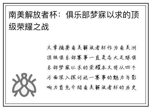 文章摘要:南美解放者杯作为南美洲顶级俱乐部赛事,一直是各大足球俱乐部梦寐以求的荣耀。本文将从四个方面深入探讨这一赛事的魅力与影响力,首先介绍南美解放者杯的历史与价值;其次分析该赛事对南美足球的巨大推动作用;再者,探讨俱乐部如何通过该赛事提升自身影响力;最后,以近几年赛事的例子展示其全球化的影响。通过这些分析,本文展现了南美解放者杯作为俱乐部顶级荣誉的独特意义。
